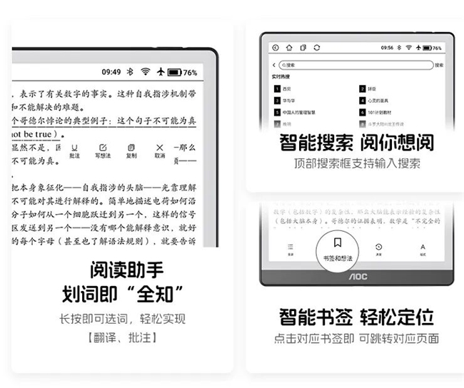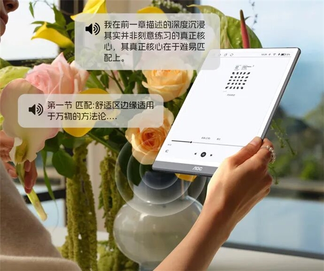 当秋风渐起、冬雪纷飞,AOC小Q MAX阅读器8R1的冷暖双前光调节功能显得格外贴心。从清晨的第一缕阳光到深夜的温暖灯火,自由调节的前光让阅读氛围与季节完美融合。基于AOC系统级深度开发的京东读书app,让您在寒冷的冬日里畅享60万+精选电子书的温暖陪伴。新增PDF文档重排功能让学习资料在任何光线下都清晰易读,兼容二十余种格式确保您珍藏的每一本好书都能完美呈现。升级的AI人声朗读系统搭配1.5W大振幅扬声器,当双手需要取暖时,纯净细腻的音质和生动的人声朗读为您带来听觉上的阅读享受,让这个秋冬的每一个阅读时刻都充满诗意与温情。