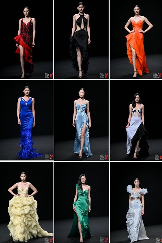 整场大秀融合建筑般的结构理性与花卉般的柔美诗意,通过全手工制作的褶饰如折纸般精巧,立体剪裁塑造出雕塑感的衣身线条,莲花意象以细腻手法点缀其间。面料上选用泛着微光的缎面、轻盈的欧根纱与通透的薄纱,在步履流动间勾勒出刚柔并济的视觉平衡,诠释出高定工艺中罕见的结构感与灵动感并存之美。