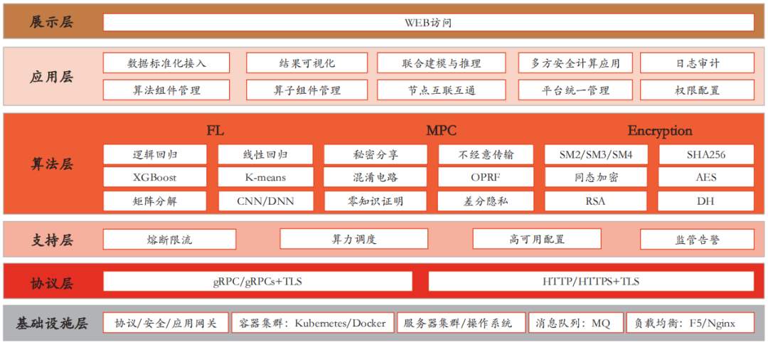平台采用分层架构设计模式,系统功能模块化,平台基于“集中管控、分级管理”架构体系,结合去可信第三方的对等联邦学习算法系统架构方案。在参与联合建模的机构搭建对等的平台客户端,通过节点间的可信互联实现联合建模等任务的达成。平台应用主要分为WEB展示层、应用服务层、算法引擎层、通信服务层和数据接入层(如图1所示)。平台拥有良好的系统稳健性,进一步保障联邦模型的安全。同时系统支持实体部署、容器部署、云上部署等多种方式,能够有效降低企业风控联合建模协作所需的人力成本,真正意义上实现降本增效(如图2所示)。