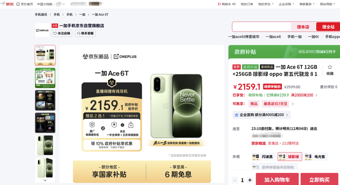 目前,京东同步开启一加 Ace 6T预售,部分地区可享政府补贴,到手价2159.1元起,还可享至高6期免息、以旧换新至高补贴1100元、直播间赠有线耳机、晒单赢30元京豆、赠1900元新机权益礼包等福利,参与一加 Ace 6T原神神里绫华定制机预约还可享赠原厂保障服务包(电池保两年+延长保一年+后盖保一年)。