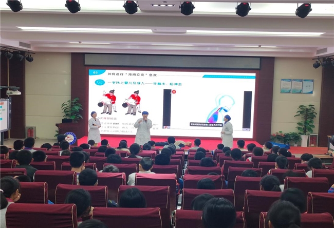 培训师尉乃丹以风趣幽默、深入浅出的方式为同学们带来了一场生动的急救知识讲座。原本高深莫测的急救知识,在她通俗易懂的讲解下,化身为人人皆可掌握的“救命指南”。详细介绍了海姆立克急救法的使用技巧,通过“听它说,跟它做”的操作法及“剪刀、石头、布”的快速定位口诀,让复杂流程变得简单易记。她现场邀请学生上台演示针对不同人群的施救方法,使同学们直观掌握了这项“生命的拥抱”技术。