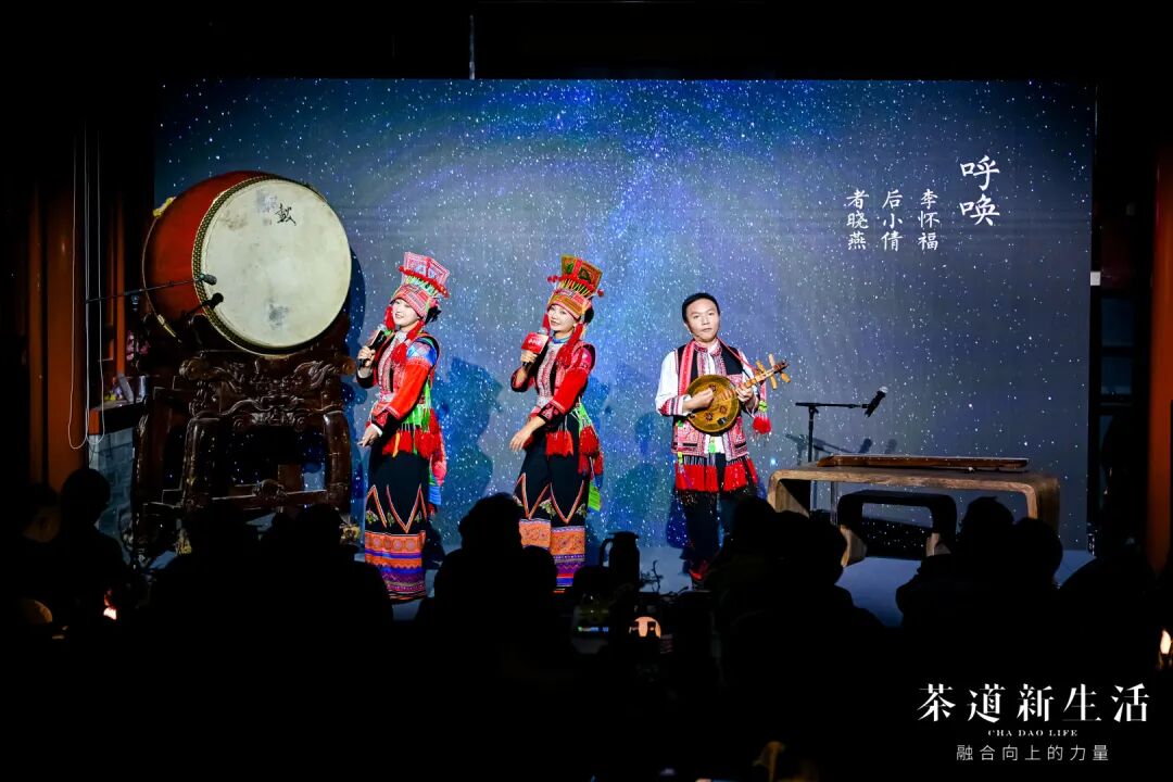 鼓声落下,彝族海菜腔非遗传承人、传唱人李怀福、后小倩、者晓燕以云南彝族独特的海菜腔韵律,带来《呼唤》。歌声高亢悠扬,如穿越群山的风,直抵灵魂深处。歌里藏着云南山水的灵秀,也藏着茶农对土地、对茶的深情呼唤,让每一位观众感受到,茶是与土地、与人紧密相连的生命。