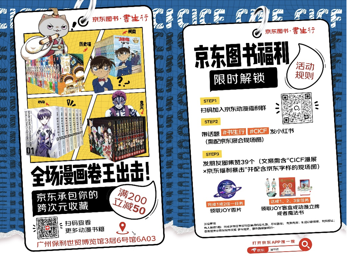 这场融合行业洞察与用户互动乐趣的动漫盛会,正等待每一位爱好者参与!10月2日-5日期间,用户前往广州保利世贸博览馆,即可解锁京东图书带来的专属福利,近距离感受国产动漫的独特魅力,与京东图书一同为中国动漫产业发展助力!