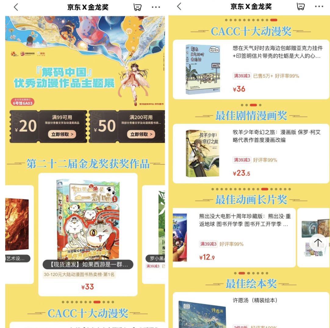 同时京东图书还在线上推出了“「解码中国」优秀动漫作品主题展”专区,将本次金龙奖获奖作品一网打尽,打开京东APP搜索“金龙奖”、“动漫金龙奖”或“中国动漫金龙奖”即可进入活动线上页面,动漫作品还有满99减20与满200减50的限时活动,众多惊喜奖品与消费优惠等你来解锁!