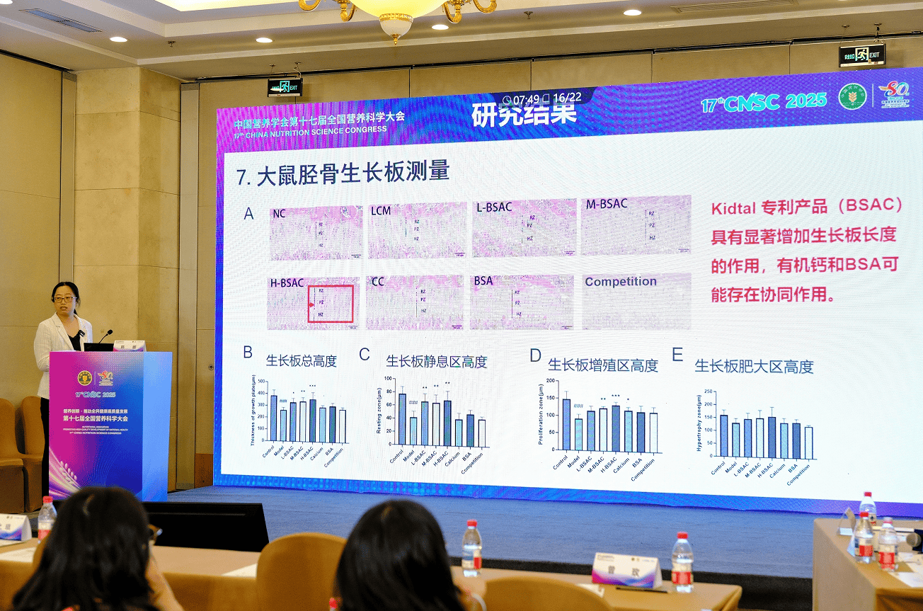 韩娜教授在发言中指出,儿童生长迟缓除了遗传及疾病等不可控因素外,更多源自营养不良、运动不足和睡眠不足等复合原因。在这一背景下,单一钙剂的补充效果往往有限,而多营养成分的协同补充能带来更显著的效果。团队通过动物模型实验验证发现,与等剂量单一有机钙补充相比,Kidtal®配方能更有效地促进生长因子分泌与生长板发育。
