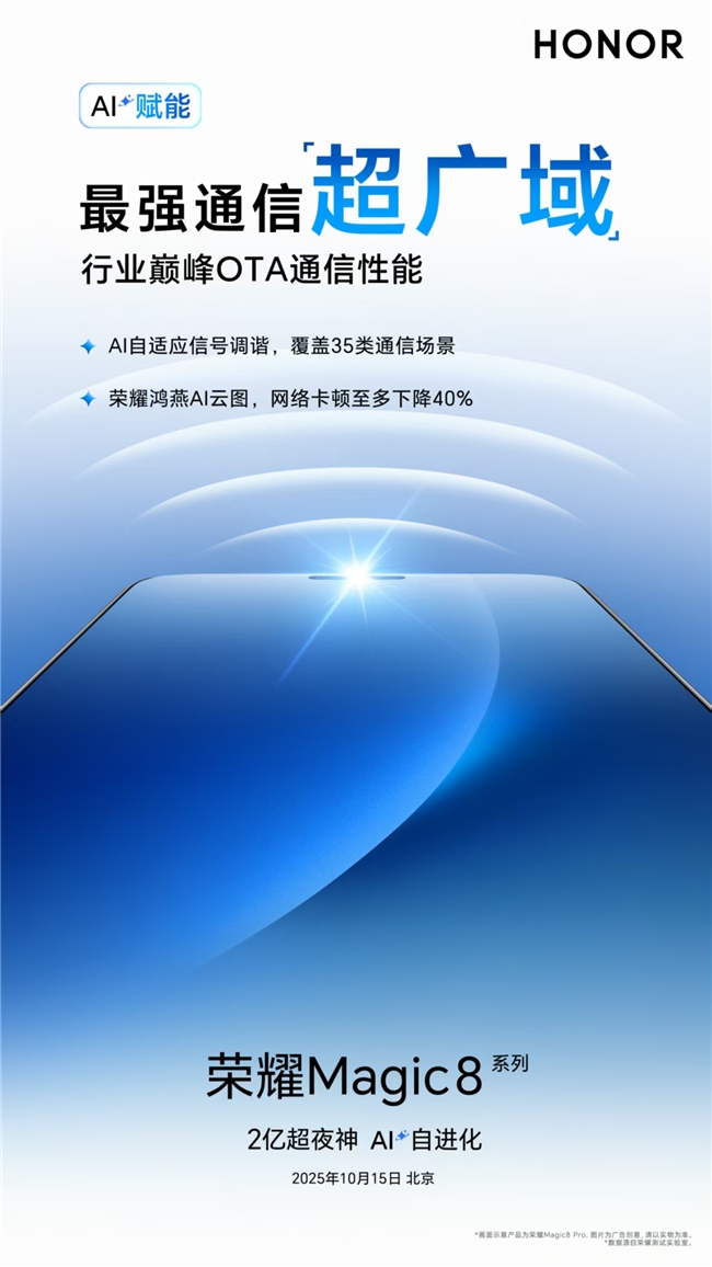 荣耀Magic8系列的信号优势,源于通信技术的持续突破。即将发布的荣耀Magic8系列搭载了荣耀自研的全新“鸿燕六翼天线”,将整机金属结构转化为信号引擎,做到相比上一代信号至高提升70%;此外荣耀Magic8系列拥有最强通信超广域,行业巅峰OTA通信性能,AI自适应信号调谐,覆盖35类通信场景,配合荣耀鸿燕AI云图,网络卡顿至多下降40%。