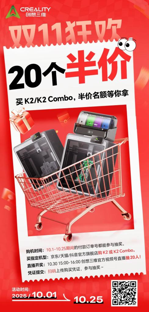 此外,10.1-10.25期间在官方旗舰店购买K2或K2C机型的用户,还可参与“20个半价购机名额抽奖”,双重福利叠加,进一步提升购机性价比。无论是专业创作者还是3D打印爱好者,都能在享受优惠的同时,参与创意互动,解锁更多惊喜。