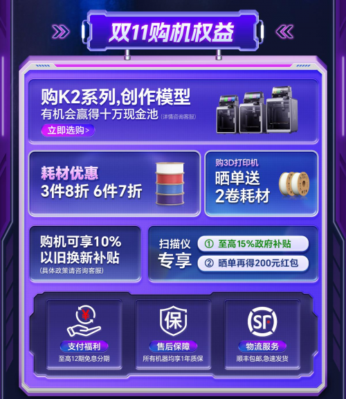 本次活动覆盖3D打印机、扫描仪、雕刻机及耗材全品类,不仅有爆款机型首发价格回归、多档折扣叠加,更推出K2系列10万元现金创作大赛+半价抽奖双重加码,同步强化售后保障,让用户“买得值、用得爽、无顾虑”!
