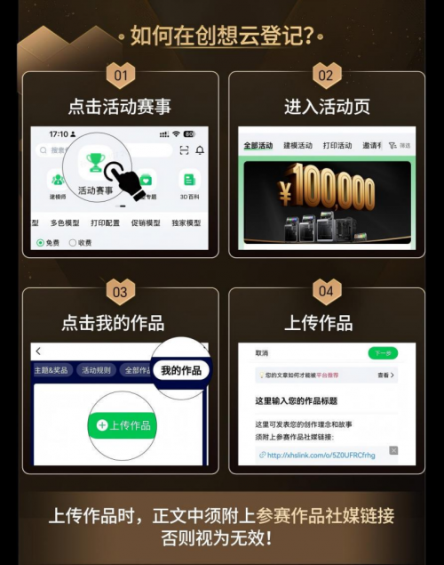 活动规则:用户使用K2系列机型完成创意打印作品,记录创作过程并发布至社交平台,同步在创想云完成登记即可参与。