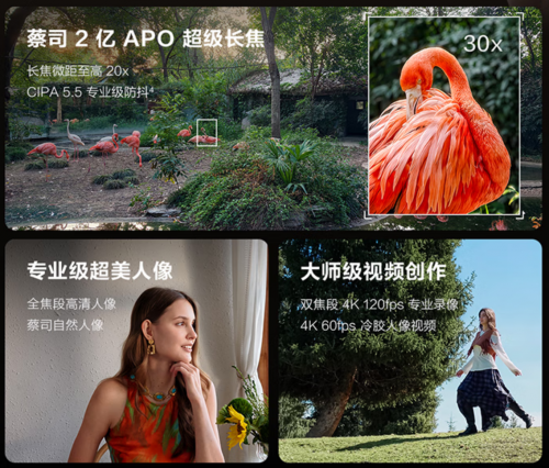 vivo X300后置蔡司2亿超级主摄、蔡司APO超级长焦、蔡司超视野超广角摄像头,还配置全焦段变焦闪光灯;其中,深度定制的蔡司2亿超级主摄,配置超稳CIPA 4.5级防抖、高规格蓝玻璃,带来超清画质,支持AI电影分镜,可智能裁剪,轻松构图;支持全焦段高清人像、蔡司自然人像、夜景人像、烟花人像、运动人像、Live Photo、撕拉片人像,人像清晰、出彩;搭载蔡司5000万超清AF前摄,自拍清晰、立体、自然;蔡司APO超级长焦配合全新升级的舞台模式,支持超清舞台录像、4K双视野录像,拍摄舞台更优质;带来电影级专业拍摄,支持4K 120fps HDR、4K 60fps 冷胶人像视频,获得更具网感的视频色调;支持Live Photo AI消除、AI风光大师、AI定制美颜,修图更简单。此外,vivo X300可搭配2.35x长焦增距镜,远距离拍摄更清晰。