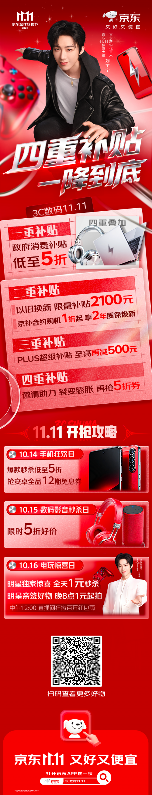 京东11.11火热进行中,为了让消费者能以更划算的价格入手3C数码产品,10月14日起,京东3C数码带来四重补贴好物大放价和3C数码尖货抢先购福利,在京东下单3C数码好物的消费者可享政府消费补贴低至5折、以旧换新限量补贴2100元、京补合约购机1折起还享2年质保焕新、PLUS超级补贴至高再减500元、邀请助力裂变膨胀再抢5折券等四重补贴福利,产品到手价格更低。即日起,打开京东 APP 搜索“3C 数码 11.11”,即可解锁海量优惠,省心省钱焕新3C数码产品。
