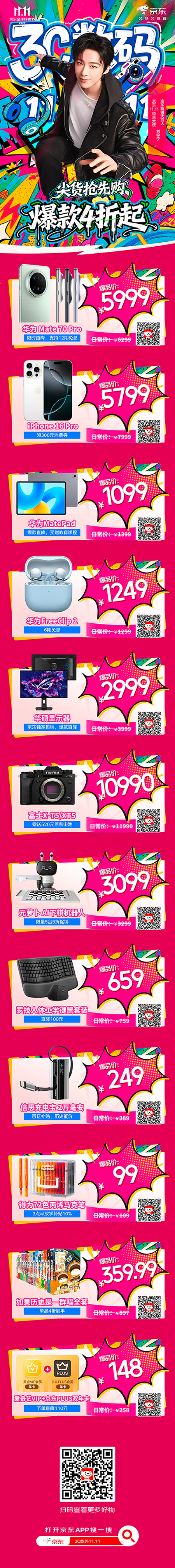 本次京东11.11还准备了 3C 数码 “尖货抢先购”福利,多款热门产品直降低至 4 折,更有直降优惠、叠加免息等福利,无论是追新旗舰的数码爱好者,还是刚需焕新的实用派,都能在这里找到高性价比好物。华为Mate 70 Pro限时直降,支持12期免息,爆品价5999元;iPhone 16 Pro 可领300元消费券,爆品价5799元,轻松入手无压力;华为MatePad爆款直降,买赠教育课程,活动价1099元;华为FreeClip 2享6期免息,爆品价1249元;京东独家包销款的华硕显示器,爆款直降后仅2999元;富士X-T5/XT5相机买赠520元原装电池,爆品价10990元,轻松满足专业创作需求;元萝卜AI下棋机器人限量5台5折促销,爆品价低至3099元;罗技人体工学键鼠套装直降100元,爆品价659元;倍思2万毫安充电宝享百亿补贴,爆品价249元,刷新历史低价;得力72色丙烯马克笔享“3 点半放学补贴10%”,爆品价99元;《如果历史是一群喵》全套单品4折,到手价359.99元;爱奇艺VIP+京东PLUS双年卡下单直降110元,爆品价148元。