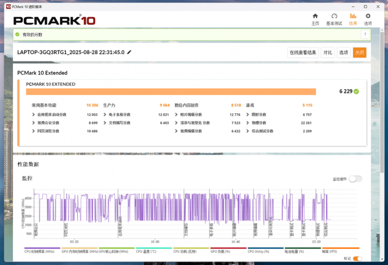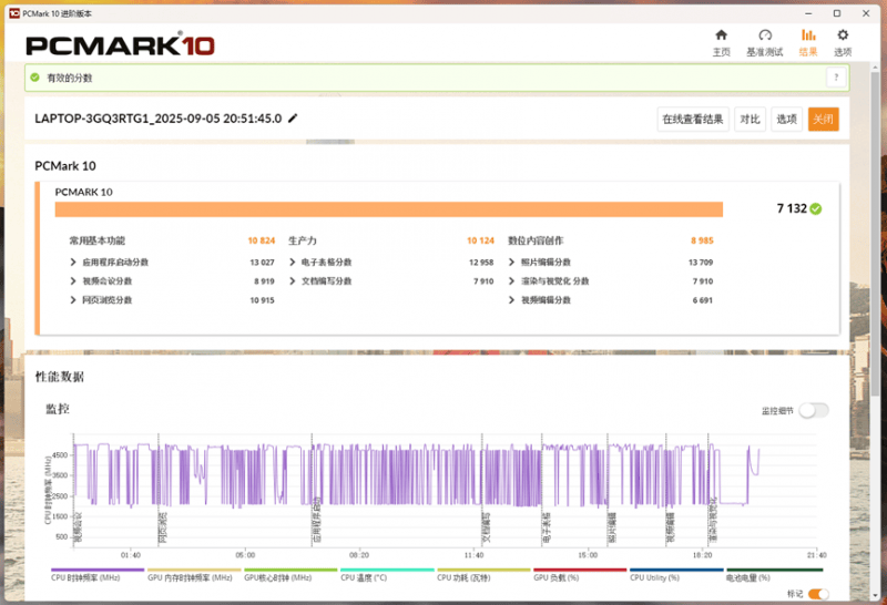 通过下图的实测可以看到,常用基本功能跑出了10824的成绩,表现优秀;生产力跑出10124的成绩,也超出了笔者的预期;数位内容创作也得到了8985的分数,能够应用办公场景下的图片编辑、视频编辑等简单的工作负载。7132的总得分,足以满足各种办公应用的需求。