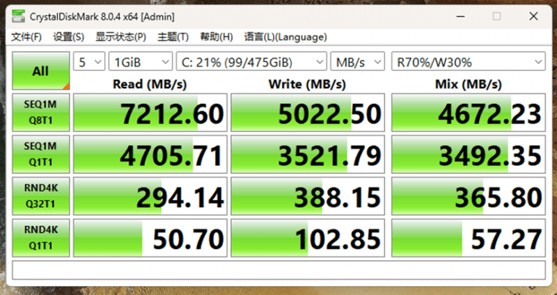 硬盘方面,ThinkPad T14 Gen6 笔记本电脑采用了一块 512GB PCIe 4.0 NVMe SSD,通过 CrystalDiskMark 的测试我们可以看到,顺序读取速度达到了7212.60MB/s,顺序写入速度5022.50MB/s;4K随机读取速度为50.7MB/s,4K随机写入速度为102.85MB/s。对于一块 PCIe4.0 的固态硬盘而言,这样的成绩表现已经算是相当优秀,达到了 PCIe4.0 SSD的中高端性能水平。
