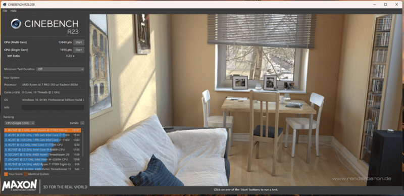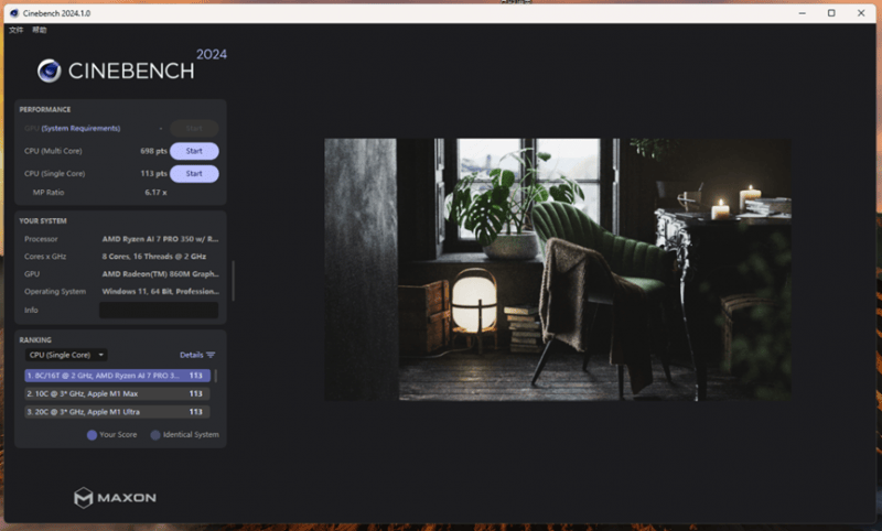 首先,我们进行CPU性能的测试。我们将采用 CINEBENCH R23 和 2024 软件来测试一下 AMD锐龙AI 7 PRO 350 处理器单核和多核表现。这里需要重点介绍一下。