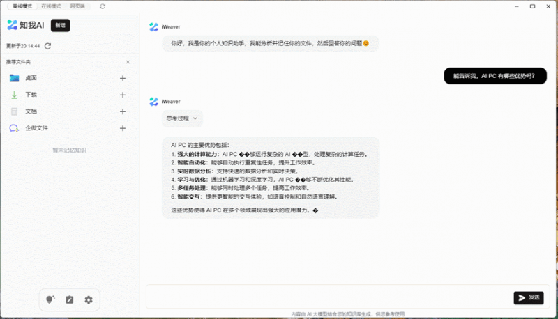 首先,用知我AI本地模型进行的测试。以上是对话过程,通过试用我们发现,在不连接网络的情况下通过知我AI进行对话,不但使用起来非常流畅,而且也能够获得想要的知识。这也不难看到,AMD锐龙AI 7 PRO 350 处理器所搭配的CPU+GPU+NPU的算力组合,能够为本地大模型的运行提供强劲的算力支持。