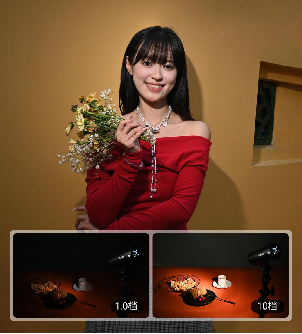 金贝HD100支持10档的功率调节和0.1级微调,无论是近景特写补光,还是远景环境光填充,都能找到刚好的光线强度,实现 “想要多亮就多亮”。