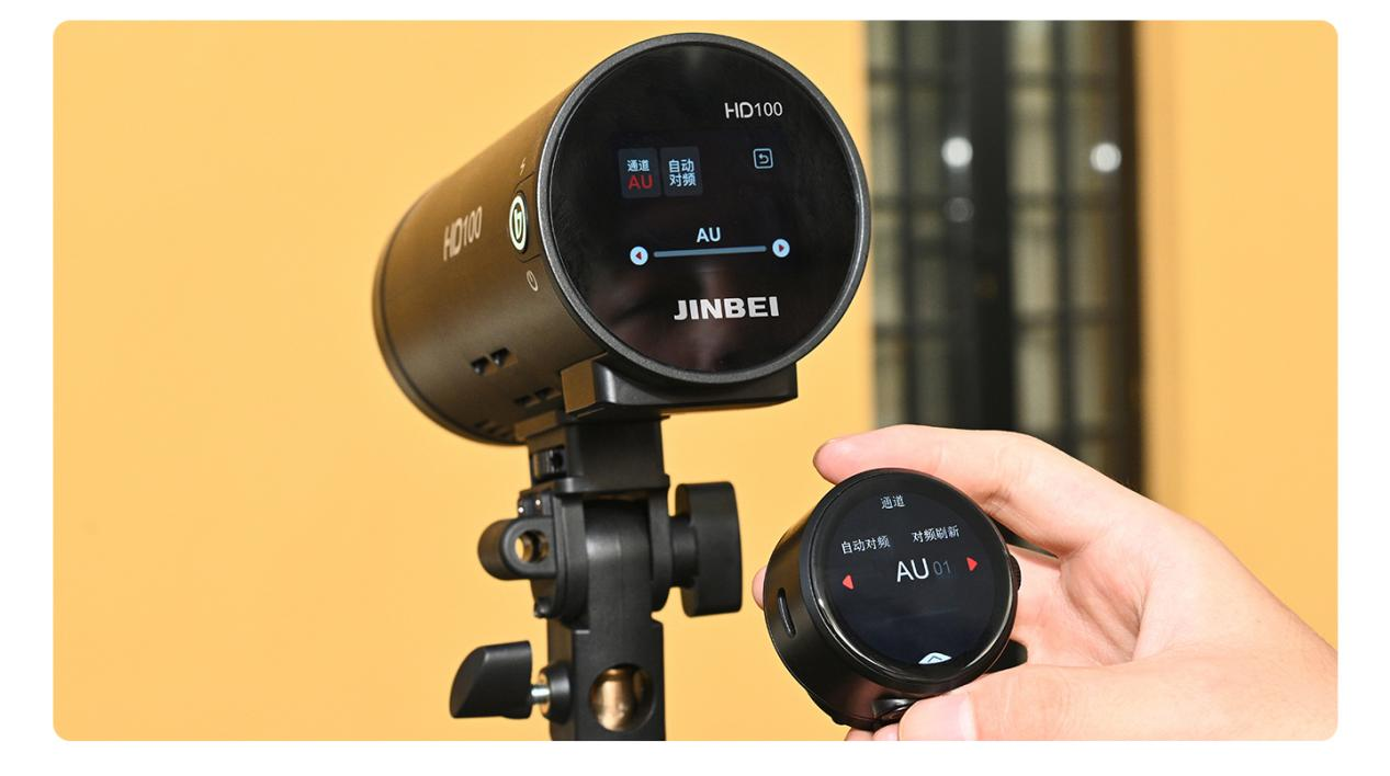 HD100外拍闪光灯内置的金贝2.4G无线引闪系统,兼容金贝TR-Q8、TR-Q7II/Q7和TR-Q6II引闪器,支持31个频道(CH:01-31)和16个组别(GR:A-U),并且可以通过机身侧边的组别灯直观了解目前的组别状态。调整到AU频道时可以与Q8引闪器和金贝HD2PLUS机顶闪光灯实现自动对频。