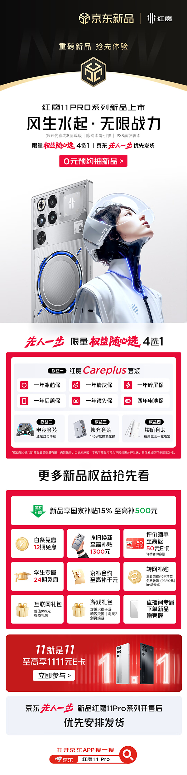 为进一步满足消费者新品国补换新需求,给予用户更多“抢鲜”权益,京东携手红魔等3C数码厂商、运营商及回收企业,发起“京东先人一步加速换新计划”——消费者在京东下单3C数码新品可享国家补贴叠加以旧换新补贴、京补合约等多重补贴福利。同时,在新品服务权益加码的基础上,消费者还可享受“权益随心选”这一全新购新方式,获得更加自由灵活的换机体验。想要先人一步到手红魔11 Pro系列,那就快来京东11.11预约,发布会后第一时间下单吧。
