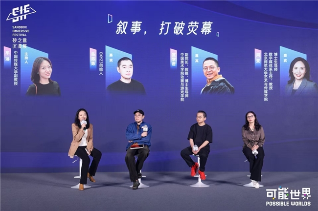 在上午的圆桌对话环节,中国传媒大学副教授车琳作为主持人,与OXYZ3创始人陈陈陈,中国美术学院动画与游戏学院副院长、教授、博士生导师宣学君,北京师范大学艺术与传媒学院数字媒体系主任,教授,博士生导师周雯三位嘉宾,以“叙事,打破荧幕”为题,从媒介的演变历程切入,探讨了新媒介形态下叙事方式的演变。