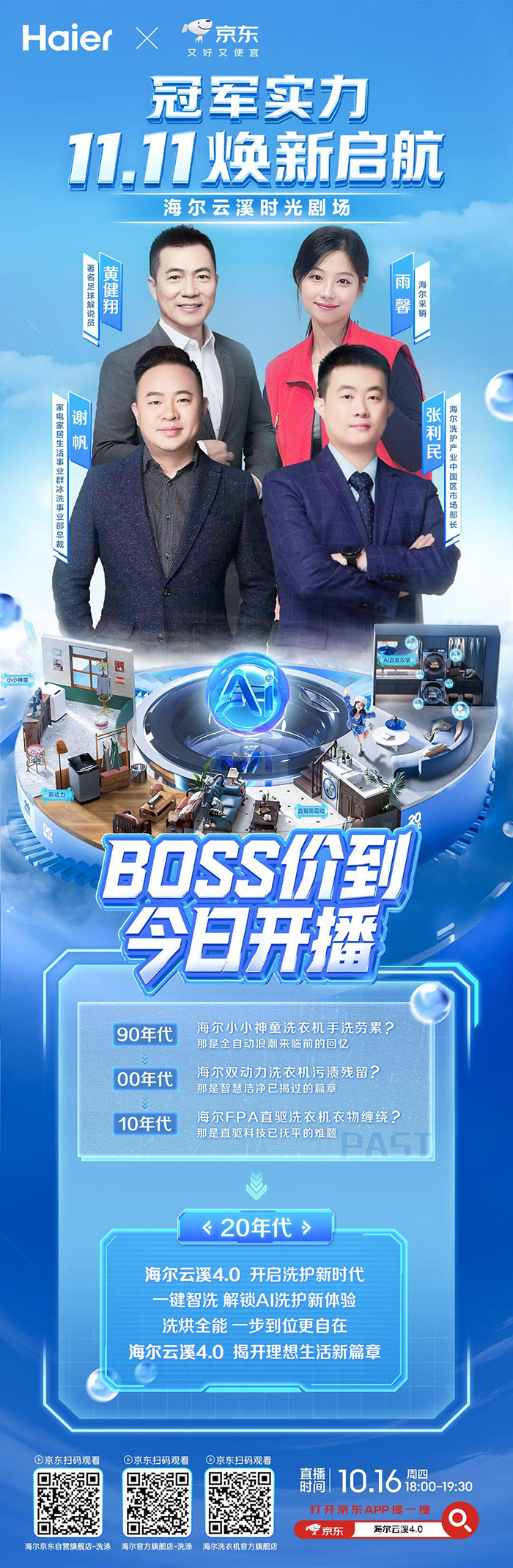 今年11.11大促刚启幕,一众家电家居知名品牌总裁便空降京东直播间,为消费者送上惊喜福利。10月16日晚18点,海尔洗护产业中国区市场部长张利民将做客京东家电家居采销直播间,携手京东家电家居事业群冰洗事业部负责人和著名足球解说员黄健翔共同带来一场“时空穿越”式的科技大秀。双方将带领消费者回顾洗衣技术从“洗净”“护衣”到“静音”的演进历程,并在“未来实验室”环节首度揭秘海尔云溪4.0的AI黑科技——如何用一套系统解决传统洗护的“洗不净、伤衣物、噪声大”三大痛点,重新定义智慧洗护。