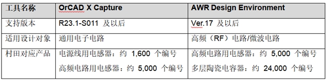 为此,村田与 Cadence 开展协作,在 Cadence 具有代表性的 EDA 工具“OrCAD X Capture”以及“AWR Design Environment”中标准搭载了村田的产品数据。