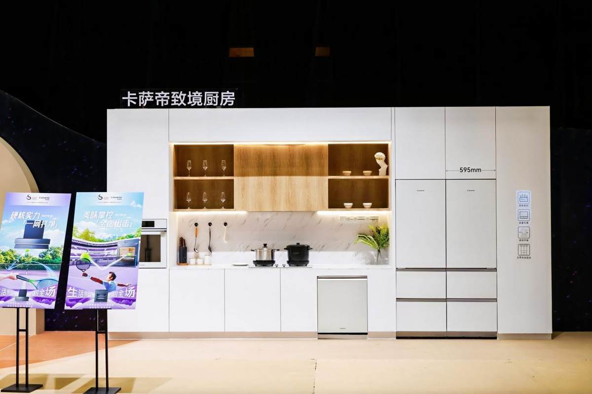 在致境厨房场景,卡萨帝致境冰箱的原创平嵌设计让冰箱真正做到无缝隐入橱柜,实现面面齐平、线线相通的嵌装效果,既节约空间又提升厨房美感。今年,卡萨帝冰箱还升级了高定平嵌服务,用户可按需定制各种材质的冰箱面板,满足一体化厨居的装修需求。此外,卡萨帝揽光冰箱创新搭载星空面光源,让用户每次打开冰箱都能得到光影流转的浪漫享受;原石冰箱的天然原石面板质感温润厚重,满足选择岩板风格装修的用户需求。