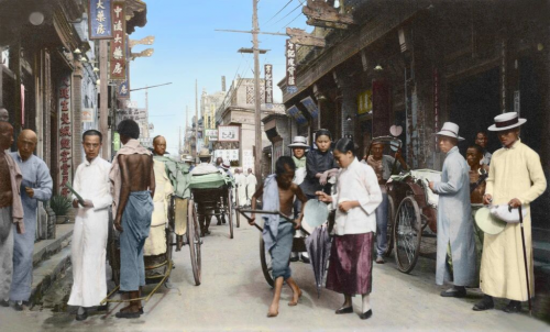 1912年~1928年,北京的商铺门脸有着特殊的装饰,往往用房檐伸出的龙头装饰悬挂店铺的字号,在这条不宽的街道上,车水马龙,摩肩接踵,一个赤脚的人力车夫正要避开一个拿伞的小脚妇人。左边售卖“玫瑰生发蜡”和“艳容雪花膏”的是中法大药房,这家药房是宁波人黄楚九于1890年在上海创办的。秦风老照片/供