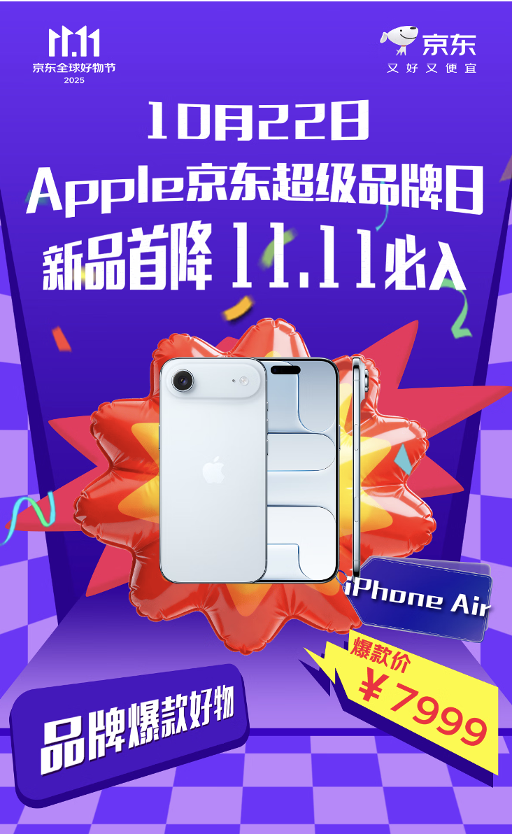 10月22日,备受期待的iPhone Air正式开售!作为Apple迄今最薄的iPhone机型,这款产品现已在京东现货发售,搭配12期免息、以旧换新补贴400元起等多重权益,更享分钟级送达服务,助你轻松拥有这款突破性设备。正值京东11.11期间,Apple京东超级品牌日推出新品首降活动,iPhone 17 Pro系列领300元惊喜券,以旧换新再补500元起,来京东APP搜索“苹果超品日”即可尽享超值福利。