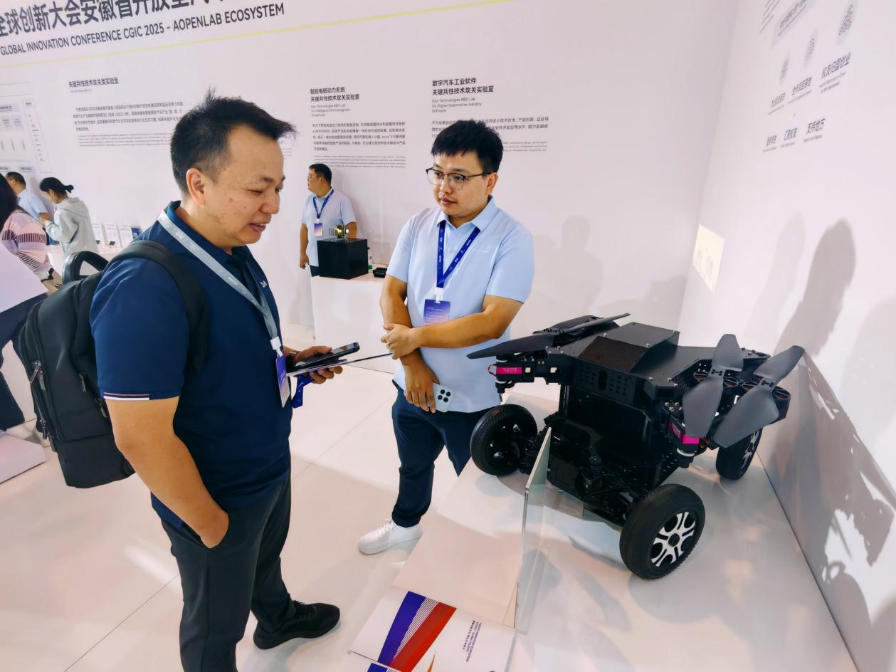 10月18日—21日,2025年奇瑞全球创新大会举行。在科大硅谷&Aopenlab生态展区,几个外国客商正饶有兴趣地询问安徽森海为视觉科技有限公司的智慧车灯技术,他们的背后是安徽三大科创引领高地——量子信息、聚变能源、深空探测的介绍。