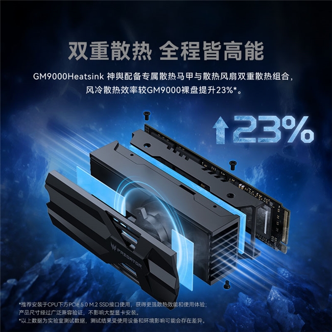 GM9000 Heatsink配备专属散热马甲与散热风扇双重散热组合,马甲区域由CNC镂空的散热鳍片组成,集成专属散热气流通道,配合高转速散热风扇,风冷散热效率较GM9000神舆裸盘提升23%,无惧长时间高负载工作,满血性能时刻保持巅峰状态。