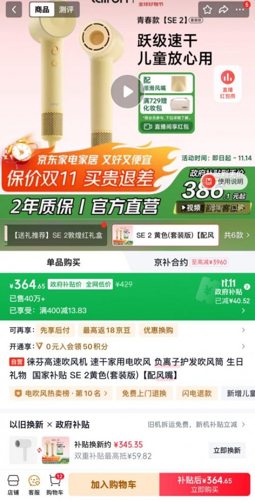 徕芬高速吹风机SE2,采用自研三相高速无刷电机配合高能聚风的气压倍增技术,合力打造21.5米/秒的高风速,干发效率提升30%。全新温度微处理智能芯片比SE一代速度提升达60%,实时关注发温变化,快干不伤发。还额外增加儿童模式,细心呵护孩子。京东11.11期间政府补贴后到手价364元,还享两年质保,买贵退差价。
