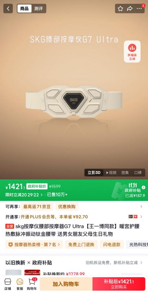 SKG腰部按摩仪G7 Ultra,升级36V澎湃电压,力度更大,手法更细腻,深层缓解腰肌不适。采用模仿人手揉捏、牵引的脉冲波形,持续收缩锻炼腰部肌肉,提升腰肌核心力量。按摩头新增氮化钛涂层,快速导热,升温更均匀,更快速到达肌肉深层,轻松揉开僵硬肌肉。11.11钜惠到手价1421元,质保2年,价保30天。