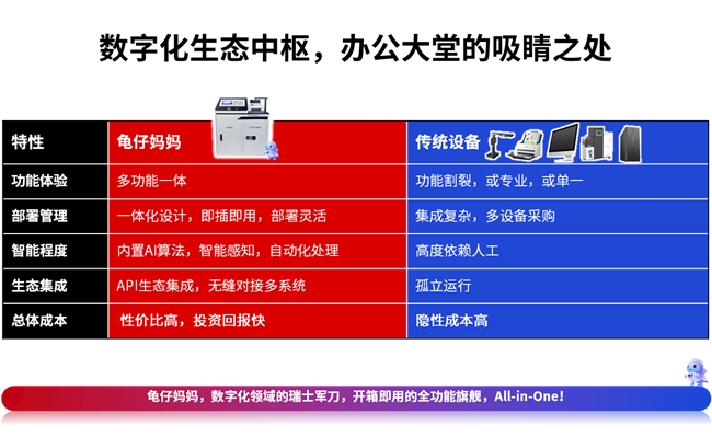 相较于传统设备高昂的隐性成本,龟仔妈妈以其高性价比和快速的投资回报率脱颖而出。企业无需投入大量资金购买多台设备,也无需承担复杂的集成和维护成本,即可享受到高效、智能的档案数字化服务。