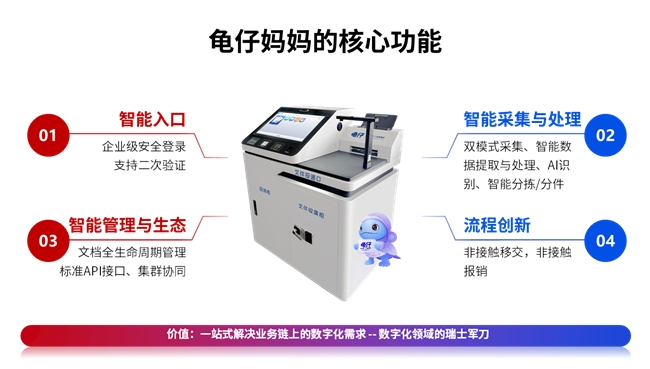 在数字化浪潮下,企业仍面临纸质文件堆积、人工处理低效、流程环节多易失控、数据孤岛难破等痛点。新档案法虽明确电子档案合法性,但实际管理中,纸质档案的数字化转化仍是“最后一公里”难题。龟仔妈妈正是针对这一需求而生——它是一台集“采集、识别、管理、集成”于一体的档案数字化智能工作站,专攻日常纸质文件处理,目标是将杂乱纸质文件一键转化为可直接融入业务系统的高质量数字化信息。