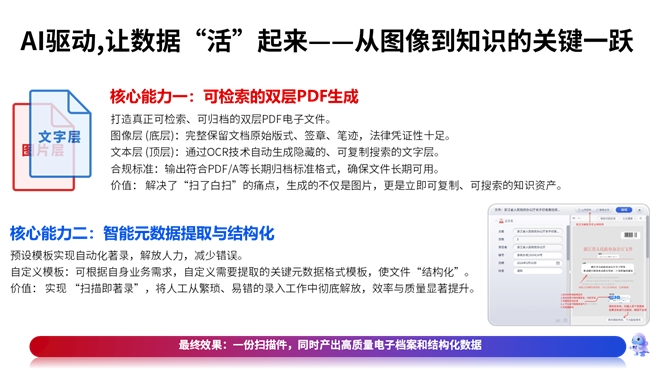 无论是普通文件,还是珍贵古籍,一机全能,无损处理。扫完即能用,自动完成OCR、文件分拣、数据提取和分类归档。让纸质档案秒变结构化数据,大幅提升了档案数字化的工作效率与准确性,减少了人工干预与错误。