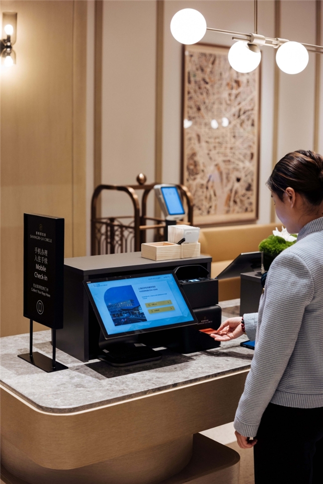 酒店快速check-in/check-out系统的出入境证件兼容性处于行业前沿,不仅可识别中国居民身份证,更可突破性支持全球护照及港澳台居民通行证,最快15秒即可完成入住办理,并且能自动绑定香格里拉会籍权益和偏好信息。如果客人在到店前已通过香格里拉APP完成了线上check-in,只需在自助机进行身份核验即可一键入住。此外,自助机能根据客人预订喜好智能匹配房间与楼层,并通过手机短信发送房号信息。客人还可自助选择房型升级或添加随行旅客。离店时,留卡一步完成退房,扫码开具电子发票,彻底省去排队和人工操作的繁琐。