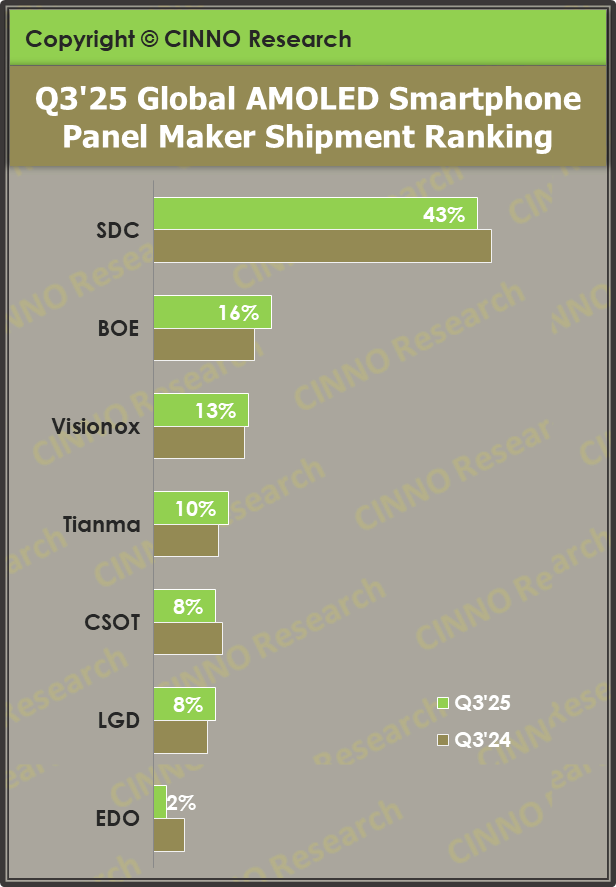 根据CINNOResearch统计数据显示,2025年第三季度全球AMOLED智能手机面板出货量约2.5亿片,同比增长11.7%,环比增长20.3%,实现同比与环比双增长,市场景气度持续回升。国内面板厂商维信诺(002387)三季度出货量同比增长16.7%,出货量排名位居全球第三。