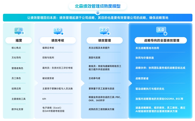 北森关键洞察 2:AI 从 “工具化” 转向 “价值化”,AI重塑绩效全链路价值2025年AI以日为单位呈爆发式增长,但在绩效管理领域,多数企业仍局限于 “基础流程提效” 层面:部分企业用 AI 实现 “绩效表线上填写”“自动计算得分”;管理者依赖 AI 生成的 “通用评语模板”,却难结合员工实际工作给出针对性辅导;员工仅能通过 AI 查询 “目标完成率”,得不到具体的改进建议,导致 AI 沦为 “数字化装饰”,未真正减轻管理负担。