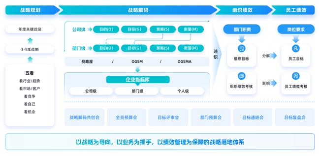 这些痛点直指传统绩效管理的核心局限:仅停留在 “员工考核” 层面,缺乏从战略解码到组织承接、再到员工落地的全链路闭环。面向 2026 年,破局关键在于构建 “战略 - 组织 - 员工” 贯通的绩效管理体系:以 OGSMA 框架将战略拆解为 “目的 - 目标 - 策略 - 衡量- 行动” 五级可执行任务,配套 “周跟踪、月复盘” 的动态检核机制,同步打通跨系统数据,让高层实时看到 “战略落地进度”、管理者精准掌握 “团队执行卡点”、员工清晰知晓 “个人任务与战略的关联”,真正实现 “战略不悬浮,执行不脱节”。