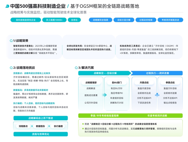 某中国500强汽车高科技制造企业,在推进“智能驾驶技术普惠化、全球化研发布局”时,面临战略传递流程断点、多系统数据孤岛、个人与组织目标脱钩三大挑战,北森为其搭建基于OGSM框架的全链路战略落地体系,从“战略制定→目标分层分解→过程动态检核→考核闭环赋能”全流程线上化管理,实现战略从公司到全球12个研发中心的层级穿透,构建“战略→目标→行动”的颗粒化落地路径,同时通过风险智能预警与动态复盘机制,让全球化战略执行效率与可控性大幅提升。