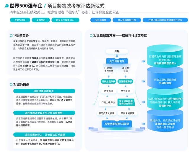 某世界 500 强头部车企,采用跨职能协作的项目组织形式,项目制考核中,曾因 “项目经理审核盲点、评价人情化、分数集中化” 陷入绩效区分困境。北森为其打造 “行政 + 项目双线并行” 考核体系:系统自动关联项目数据,行政上级与项目经理分目标审批评价,搭配多人评估强制分布机制,避免 “老好人心态” 与评估不公问题,实现权责清晰、评价客观、效率提升的绩效新范式。