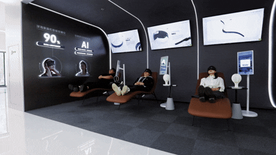 继续前行,参访者将进入冥想睡眠体验区。这里布置了舒适的体验座椅,可亲身感受Easleep深海豚脑机智能安睡仪、OxyZen仰憩舒压系统和FocusZen正念舒压系统带来的放松体验。通过脑电检测与AI算法分析,这些产品帮助人们调节压力、改善睡眠,让脑机接口技术进入千家万户。