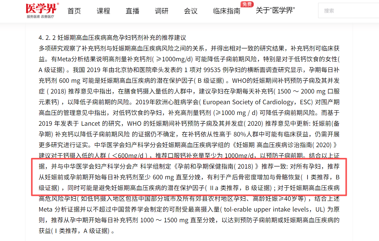 由中华医学会围产医学分会、中国营养学会妇幼营养分会编撰的《中国孕产妇钙剂补充专家共识(2021)》也强调:“对所有孕妇,推荐从妊娠前或孕前期开始每日补充钙剂至少 600 mg 直至分娩,有利于产后骨密度增加与骨骼恢复(推荐和证据级别:IB),同时可能是避免妊娠期高血压疾病的潜在保护因子(ⅡaB)。”