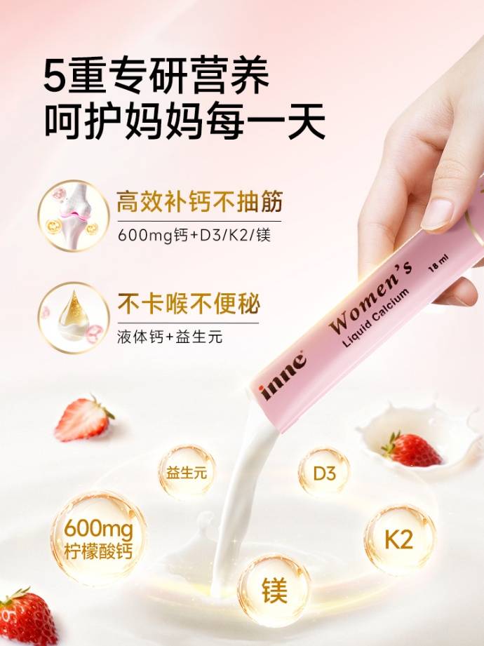 在适口性和使用体验上,inne因你美好钙采用“可以直接喝”的液体柠檬酸钙,对比钙片、胶囊钙,生物利用率更高,同时更温和、不刺激肠胃,避免便秘、腹胀、卡喉等常见不适。清爽的草莓口味和益生元配方打破补钙“难喝、易便秘”的消费者印象,让孕哺补钙更轻松。