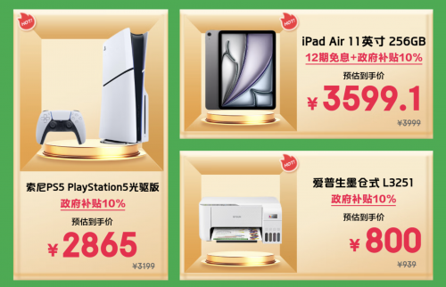 备受关注的索尼PS5光驱版,政府补贴10%后仅需2865元;iPad Air 11英寸256GB版在3599.1元补贴价基础上,叠加以旧换新300元和12期免息,进一步降低购机压力;爱普生墨仓式L3251彩色打印机在补贴基础上,还赠送限时9重礼包,仅需800元即可到手。