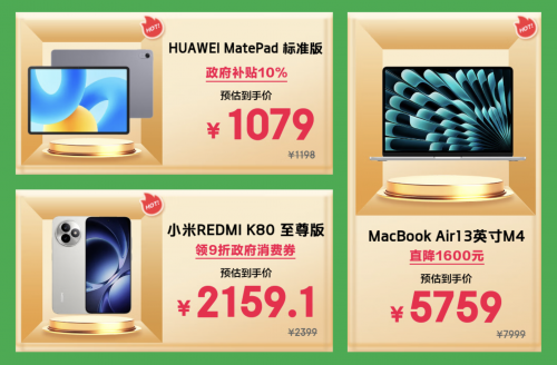 除此之外,HUAWEI MatePad标准版,享10%政府补贴,1079元即可入手;小米REDMI K80至尊版领9折政府消费券后2159.1元;苹果MacBook Air 13英寸M4版直降1600元后,再叠加10%政府补贴,5759元的价格还支持12期免息,相当于每天仅需15.9元就能使用M4芯片的轻薄本。