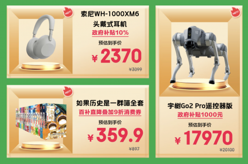 不仅如此,索尼WH-1000XM6头戴式耳机,政府补贴10%后仅需2370元;而科技潮玩宇树Go2 Pro遥控器版机器狗,不仅享受1000元政府补贴,还支持6期免息,17970元即可将这款AI仿生机器狗带回家; 《如果历史是一群喵》1-15全套,百补直降叠加9折消费券359.9即可入手,福利拉满!