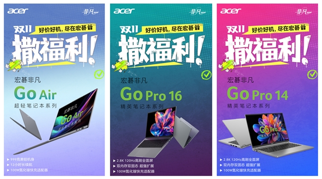 轻薄笔记本仍是今年双11最受关注的品类之一。宏碁非凡Go系列凭借轻量化机身与全新AI算力平台,为移动办公、学习与创作提供更流畅的使用体验。