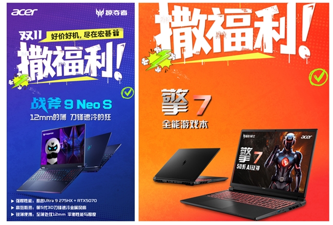 对于硬核玩家而言,双11同样是一次性能升级的契机。宏碁在高性能笔电领域持续深耕,今年的主角无疑是全新掠夺者·战斧9 Neo S与暗影骑士·擎7。掠夺者·战斧9 Neo S与暗影骑士·擎7,以强劲性能与极致设计满足不同层级玩家的需求。